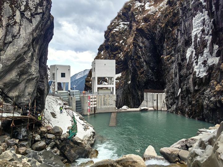 這是2025年3月17日在尼泊爾中北部拉蘇瓦縣拍攝的三金考拉水電站大壩。