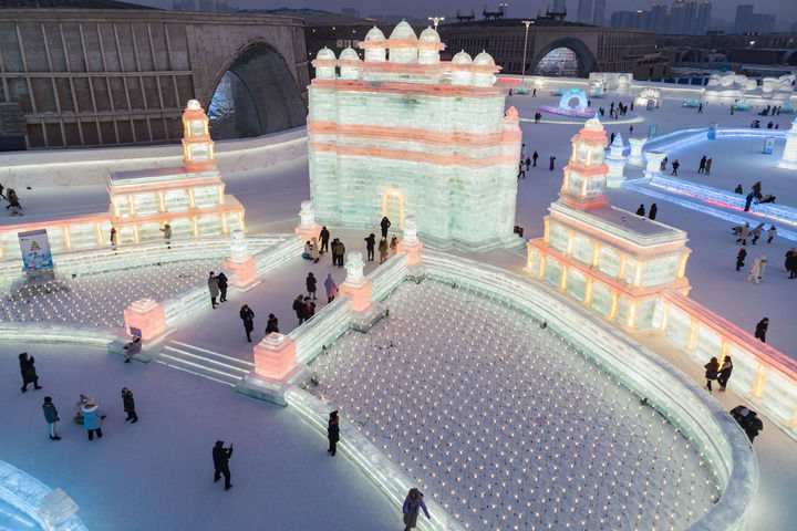 2023年2月1日,游客在哈爾濱冰雪大世界園區(qū)冰雪景觀《勝利之城》周邊游玩,該冰雪景觀以印度的法塔赫布爾西格里城為原型設計建造(無人機照片)。此屆哈爾濱冰雪大世界將上合組織成員國的特色建筑以冰雪景觀的形式呈現(xiàn)。新華社記者 謝劍飛 攝