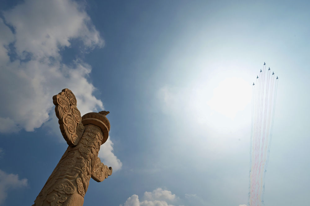 9月3日,紀(jì)念中國人民抗日戰(zhàn)爭暨世界反法西斯戰(zhàn)爭勝利80周年大會在北京隆重舉行。這是教練機(jī)梯隊接受檢閱。新華社記者 陳曄華 攝