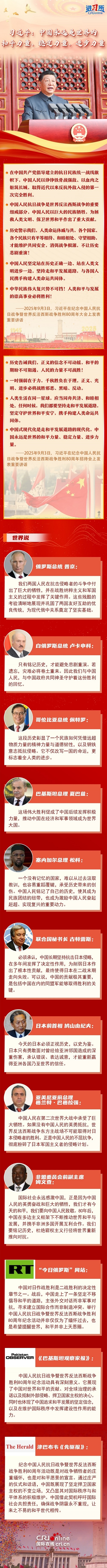 “中國永遠是世界的和平力量、穩(wěn)定力量、進步力量?!睆膭?chuàng)建聯(lián)合國到提出和平共處五項原則,再到推動構(gòu)建人類命運共同體,中國始終面向光明,做世界和平與安全的堅定維護者。國際社會高度評價中國為世界反法西斯戰(zhàn)爭勝利作出的巨大貢獻,認為抗戰(zhàn)不僅改寫中國的命運,更標志著全人類的進步;戰(zhàn)后的中國走上了一條堅定不移倡導和平發(fā)展的道路,并以此次紀念活動為契機,呼吁國際社會共擔責任,確保戰(zhàn)爭陰霾永不重現(xiàn),讓來之不易的和平世代相傳。