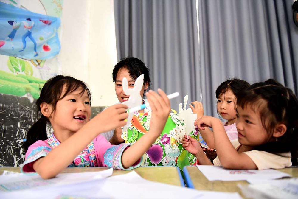 2025年7月16日,貴州黔東南州從江縣,江南大學(xué)支教老師在獨(dú)洞小學(xué)指導(dǎo)學(xué)生制作繪本彩繪。