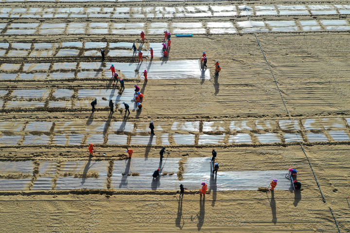 在新疆和田地區(qū)于田縣沙產(chǎn)業(yè)實驗基地,當(dāng)?shù)厝罕娫诜N植薏米(2025年4月8日攝,無人機照片)。新華社記者 丁磊 攝