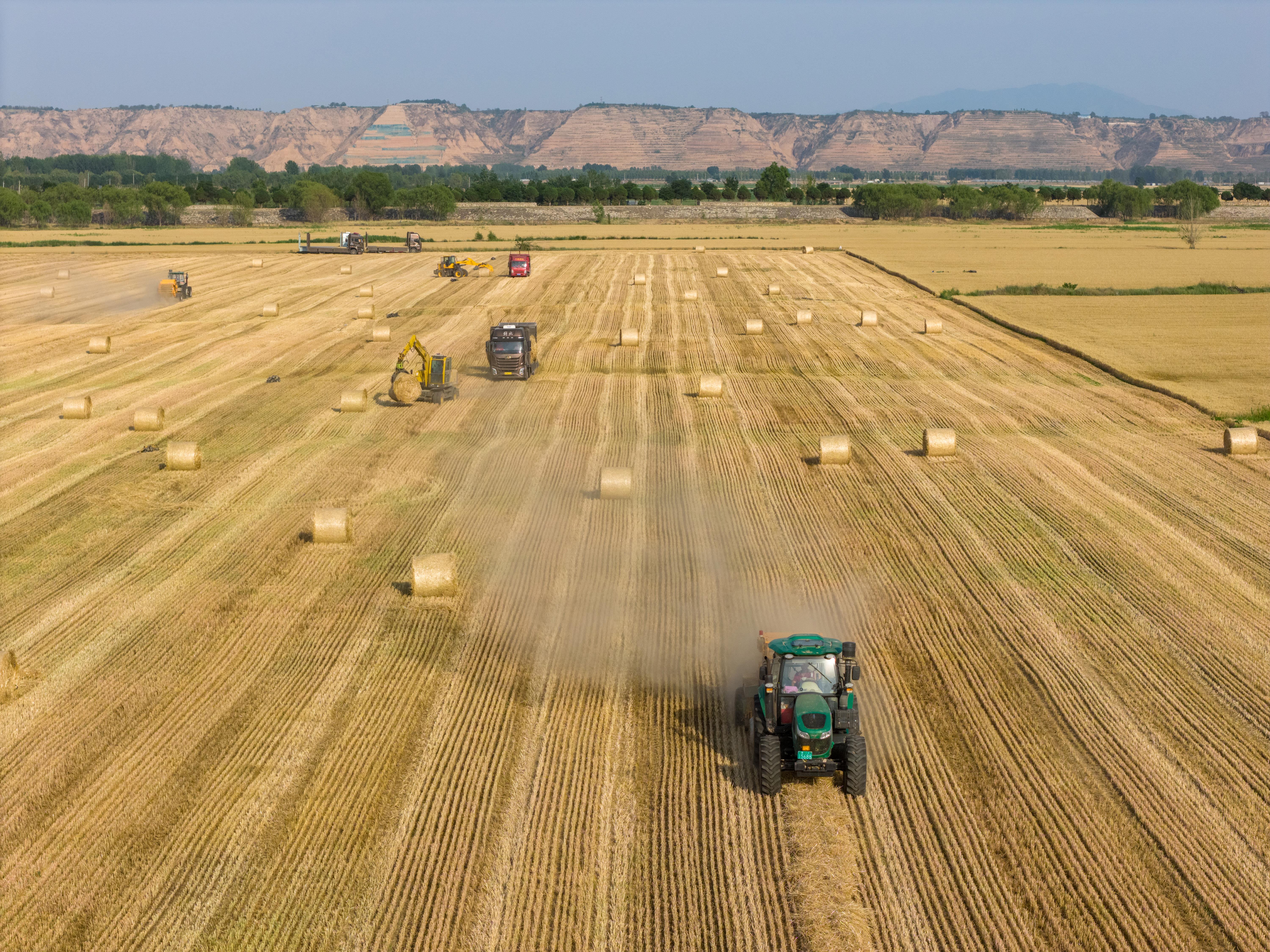△據(jù)國家統(tǒng)計局發(fā)布的數(shù)據(jù),2025年全國夏糧總產量14973.8萬噸,實現(xiàn)穩(wěn)產豐收。圖為今年6月,山西運城裴莊鎮(zhèn)黃河灘涂上,農機手忙著實施小麥秸稈打捆和裝車運輸作業(yè)。