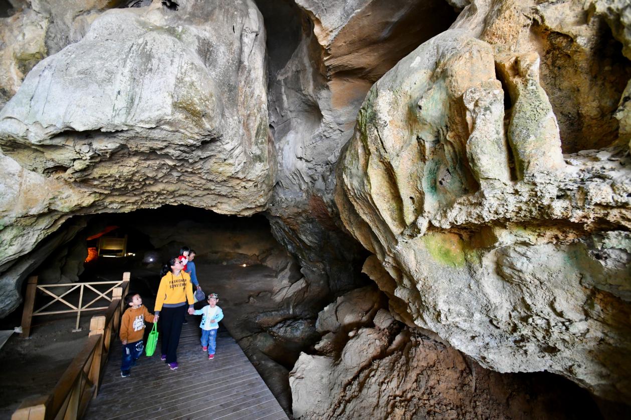 游客在萬壽巖遺址船帆洞內游覽。