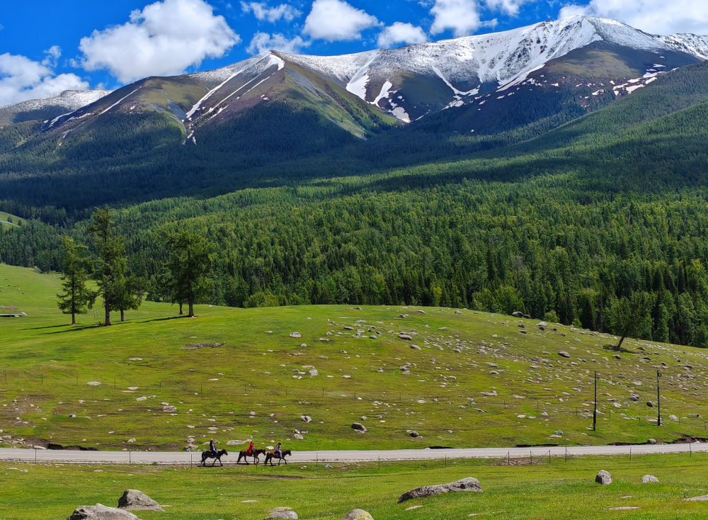 2024年6月4日,游客在新疆阿勒泰地區(qū)哈巴河縣騎馬游玩。電視劇《我的阿勒泰》播出后,新疆阿勒泰地區(qū)迎來(lái)客流高峰,“張鳳俠的小賣部”“巴太樹(shù)”“彩虹布拉克”等劇中地點(diǎn)成為熱門旅游打卡地。這場(chǎng)“邊城”與“熱劇”雙向奔赴的文旅盛宴,為當(dāng)?shù)亟?jīng)濟(jì)發(fā)展帶來(lái)新的增長(zhǎng)點(diǎn)。2024年5月,當(dāng)?shù)亟哟慰?15.03萬(wàn)人次,同比增長(zhǎng)60.81%;實(shí)現(xiàn)旅游收入36.53億元,同比增長(zhǎng)88.25%。