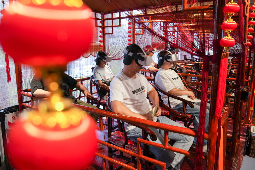 2024年7月22日,游客在“尋境敦煌——數(shù)字敦煌沉浸展”借助VR設(shè)備沉浸式游覽莫高窟第285窟虛擬場(chǎng)景。“尋境敦煌——數(shù)字敦煌沉浸展”綜合運(yùn)用VR虛擬現(xiàn)實(shí)、三維建模、游戲引擎的物理渲染和全局動(dòng)態(tài)光照等新技術(shù),高精度立體還原了莫高窟第285窟。游客戴上VR眼鏡,不僅可以零距離觀賞壁畫(huà)、360度自由探索洞窟細(xì)節(jié),還能“飛升”到窟頂,身臨其境參與壁畫(huà)故事情節(jié),沉浸式感受敦煌文化的魅力。