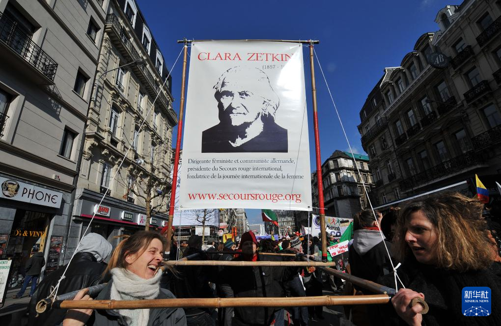 2010年3月6日,在比利時(shí)首都布魯塞爾,婦女代表抬著著名女政治活動家、三八國際婦女節(jié)的倡導(dǎo)者克拉拉·蔡特金的畫像參加慶祝三八國際勞動?jì)D女節(jié)游行。新華社記者 武巍 攝