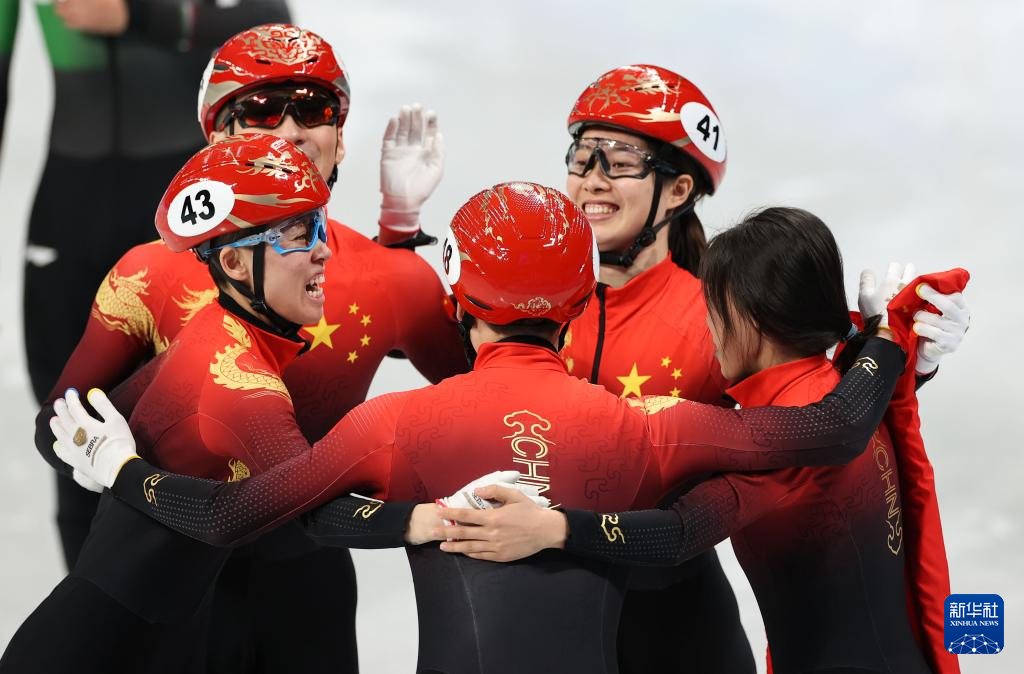 2022年2月5日,在首都體育館舉行的北京2022年冬奧會短道速滑項(xiàng)目混合團(tuán)體接力決賽中,中國隊(duì)奪得冠軍。這是中國隊(duì)選手在比賽后慶祝。新華社記者 楊磊 攝