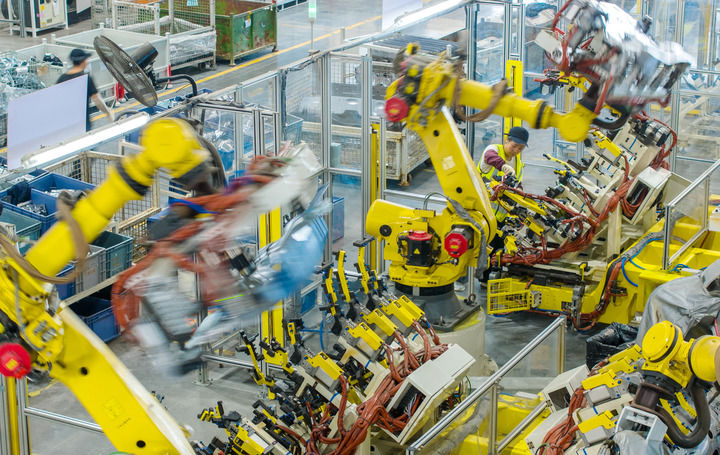 2025年10月9日,浙江省湖州市長(zhǎng)興經(jīng)濟(jì)技術(shù)開(kāi)發(fā)區(qū)一家汽車(chē)部件有限公司的技術(shù)人員操控工業(yè)機(jī)器人生產(chǎn)新能源汽車(chē)配件(無(wú)人機(jī)照片)。新華社發(fā)(譚云俸攝)