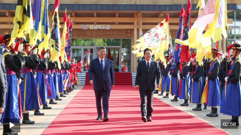 在慶州博物館的千年微笑館,李在明總統(tǒng)為習(xí)主席舉行高規(guī)格歡迎儀式,身著傳統(tǒng)民族服飾的韓國(guó)禮儀隊(duì),隆重歡迎習(xí)主席到來。