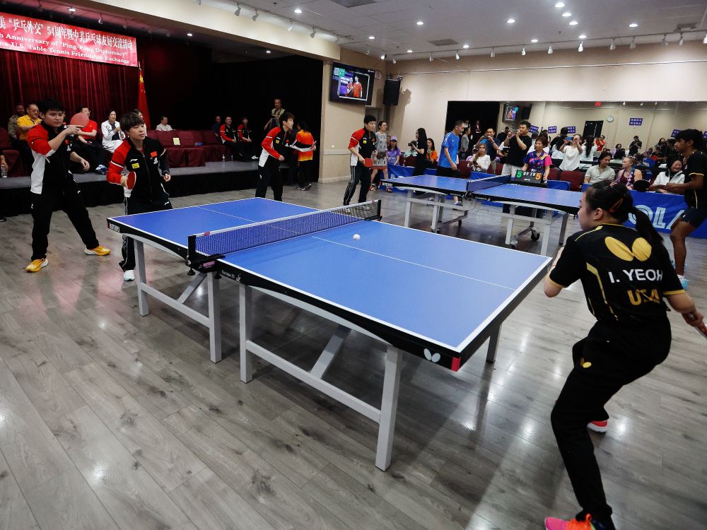 這是7月13日在美國內(nèi)華達州拉斯維加斯拍攝的紀(jì)念中美“乒乓外交”54周年暨中美乒乓球友好交流活動現(xiàn)場。新華社發(fā)(邱晨攝)