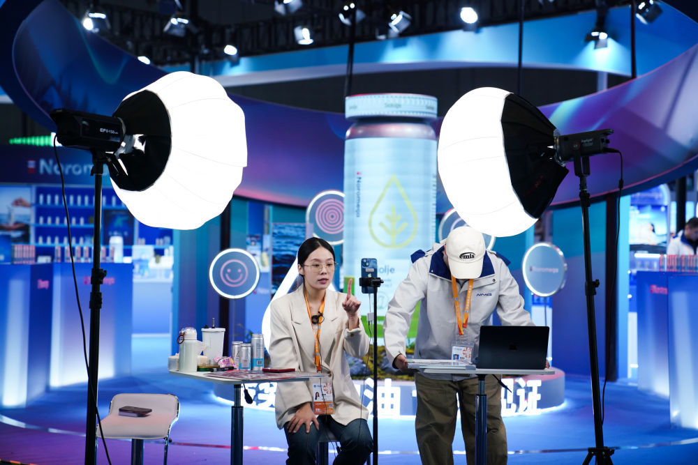 2025年11月4日,工作人員在第八屆進(jìn)博會醫(yī)療器械及醫(yī)藥保健展區(qū)直播。本屆進(jìn)博會直播密度大、形式多樣,有的展位專門搭建直播區(qū)域,燈光、背景、展板一應(yīng)俱全;有的展位手機(jī)一架、產(chǎn)品一擺,直播就地開始;還有的直播間是“流動的”,達(dá)人主播們拿著手機(jī)、別著麥克風(fēng),穿梭于各個品牌展位間現(xiàn)場推薦……八年來,進(jìn)博會影響力逐年遞增,越來越多的中國消費者愿意通過直播了解進(jìn)博會上的“全球好物”。