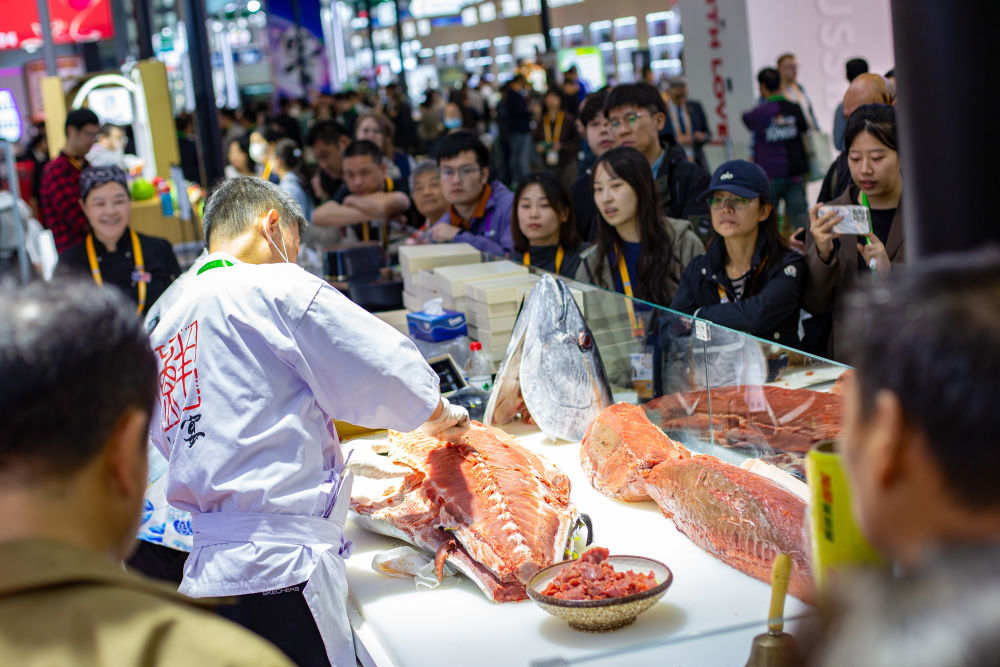 2025年11月7日,在第八屆進(jìn)博會農(nóng)食產(chǎn)品展區(qū),參觀者在一處展臺觀看開魚秀。工作人員當(dāng)場分切一條超過100公斤的金槍魚。英國奶酪、法國葡萄酒、意大利黑醋、馬來西亞榴蓮、厄瓜多爾巧克力、新西蘭乳制品、阿根廷牛肉……在本屆進(jìn)博會農(nóng)食產(chǎn)品展區(qū),多款“洋特產(chǎn)”亮相,展商現(xiàn)場加工、制作食品,供參觀者品嘗。