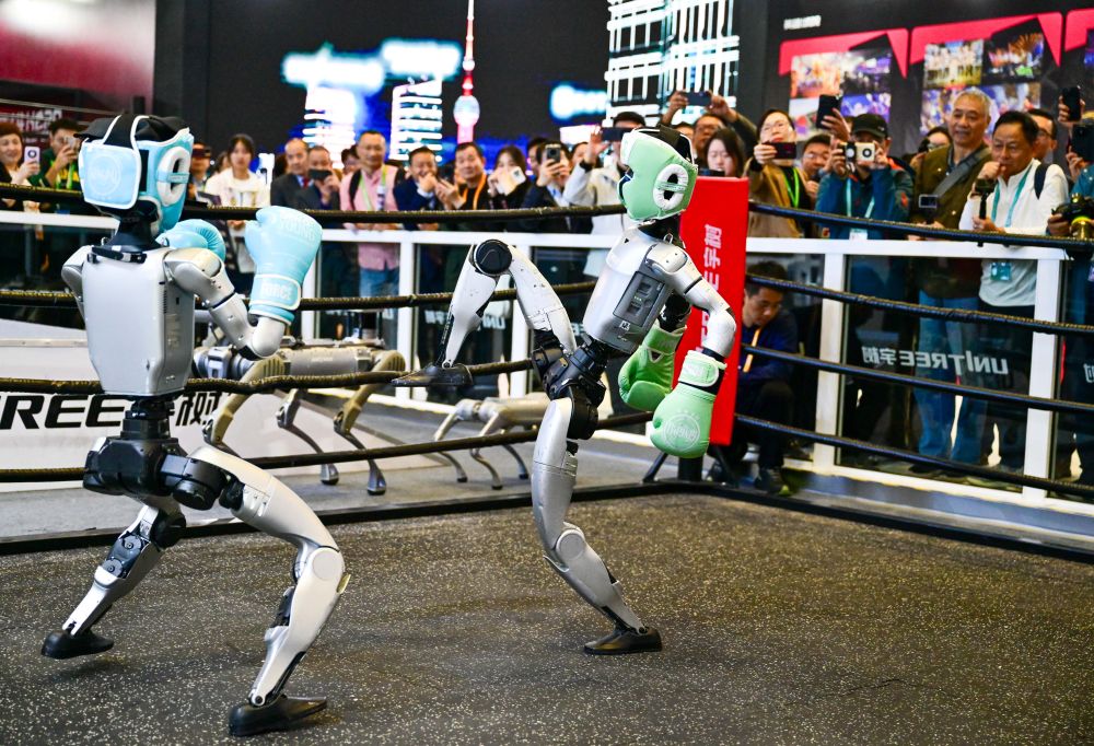 2025年11月6日,人形機(jī)器人在第八屆進(jìn)博會宇樹科技展臺進(jìn)行格斗表演。當(dāng)日,在技術(shù)裝備展區(qū)宇樹科技展臺,兩臺G1人形機(jī)器人的格斗表演吸引了眾多觀眾。它們戴著護(hù)具及拳套,施展直拳、勾拳、左右鞭腿,展示倒地自主起身等復(fù)雜動作,不時贏得觀眾喝彩。