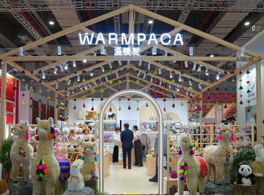 2025年11月5日在第八屆進(jìn)博會消費品展區(qū)拍攝的“溫暖駝”展臺。從秘魯阿雷基帕的小店,到進(jìn)博會的展臺,再到全球消費者手中,進(jìn)博會為“溫暖駝”帶來了巨大的發(fā)展機(jī)遇。本屆進(jìn)博會,“溫暖駝”展位面積已從2018年首屆進(jìn)博會的9平方米拓展至54平方米,并在上海、廈門等地開設(shè)6家門店。源自進(jìn)博會的“溫暖駝”訂單不僅助力秘魯200多個家庭脫貧,還倒逼一場“品質(zhì)革命”,讓羊駝玩偶制作對標(biāo)世界標(biāo)準(zhǔn)。