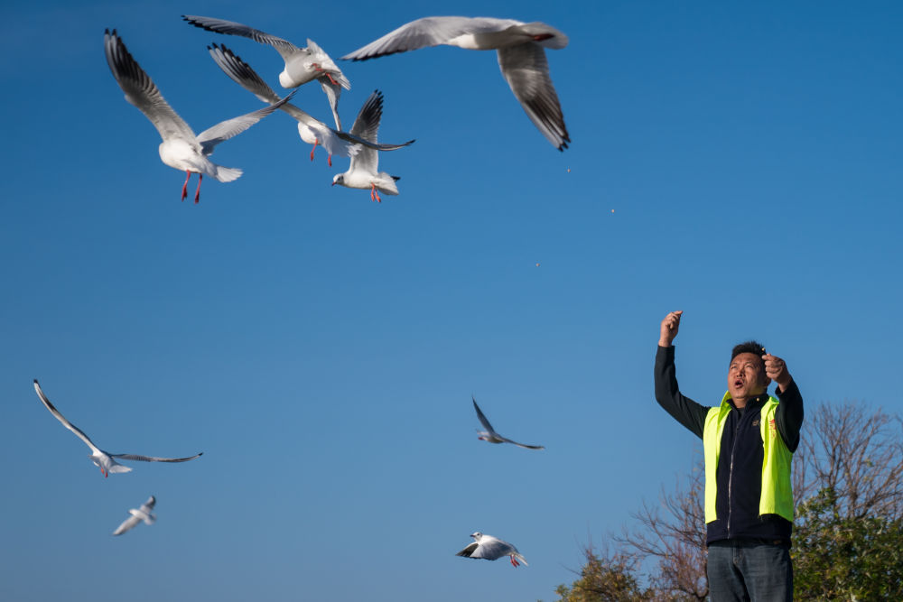 2024年12月11日,志愿者張利云在云南昆明王官濕地公園投喂紅嘴鷗。志愿者張利云堅持投喂紅嘴鷗長達十余年,為生態(tài)環(huán)境保護貢獻個人力量。
