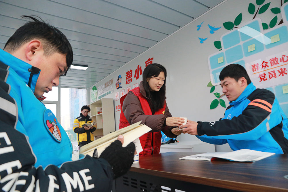 2023年12月27日,志愿者在山東省高密市密水街道“憩小亭”服務站為外賣騎手送上熱水。入冬以來,山東省高密市密水街道推進“憩小亭”暖心服務站建設,為外賣騎手、快遞小哥、網(wǎng)約車司機、環(huán)衛(wèi)工人等戶外勞動者提供飲水、無線上網(wǎng)、食物加熱等多項服務,讓他們感受到冬日里的溫暖。