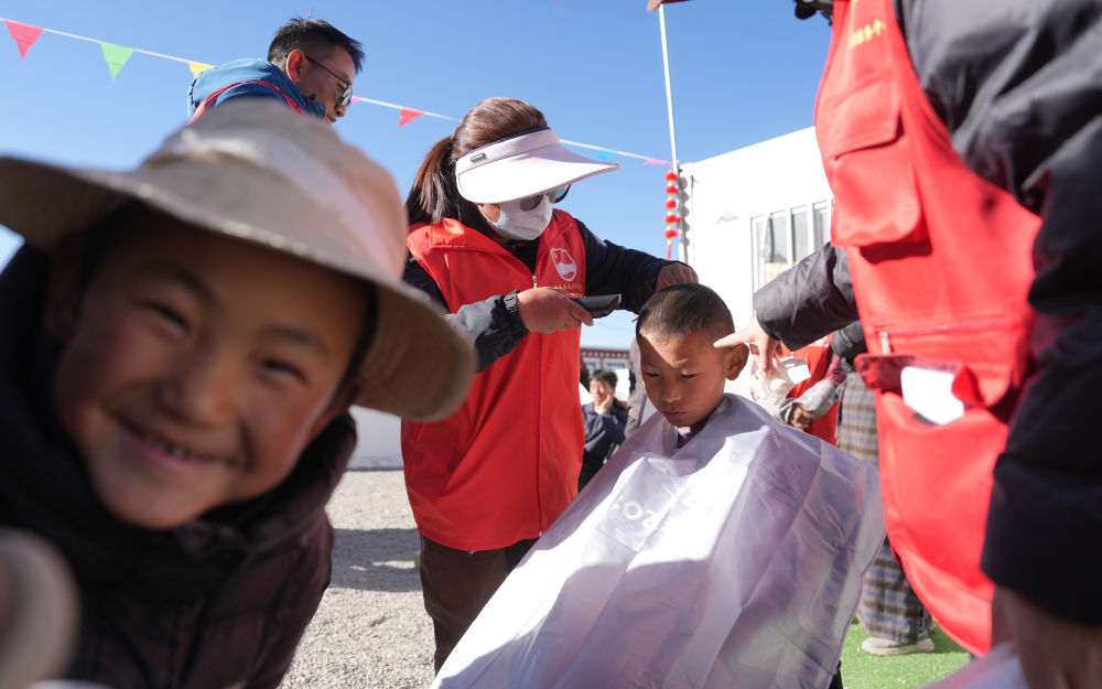 2025年1月26日,志愿者在西藏拉孜縣吉如村安置點為孩子們理發(fā)。西藏定日縣6.8級地震發(fā)生后,志愿者們迅速參與救援搜救、協(xié)助搭建帳篷、搬運賑濟物資、協(xié)調(diào)村民所需。數(shù)百名大學生組成志愿者服務隊,白天為安置點的孩子們輔導作業(yè)、陪孩子們運動;晚上組成巡邏隊,守護安置點的安寧。