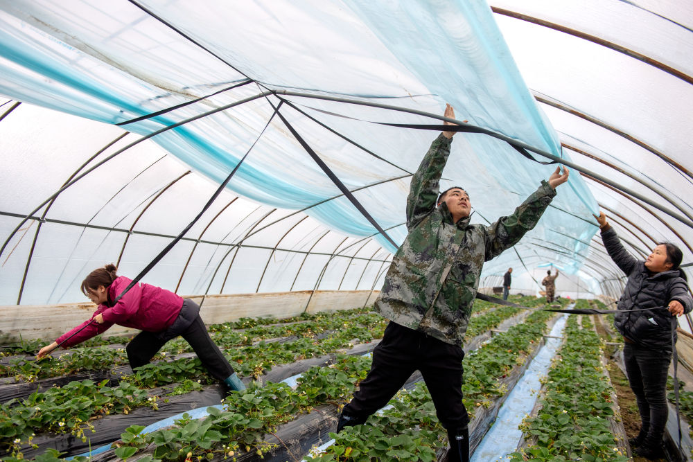2023年12月15日,志愿者在浙江湖州長興縣水口鄉(xiāng)幫助農(nóng)戶加蓋大棚保溫膜。為應對強雨雪天氣,志愿者們幫助農(nóng)戶清理大棚上的積雪,加裝綁棚繩,棚內(nèi)增設立柱,提高大棚抗風雪能力,確保農(nóng)產(chǎn)品正常生產(chǎn)供應。
