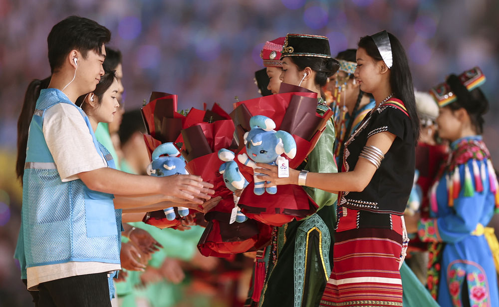 2024年11月30日,五十六個民族代表在海南三亞舉行的第十二屆全國少數(shù)民族傳統(tǒng)體育運動會閉幕式上為志愿者獻花。運動會期間,數(shù)千名志愿者“小鹿鹿”奔赴十余個競賽場館、二十多家接待酒店、媒體中心、機場車站等地,為來自全國各地的運動員、技術(shù)官員、工作人員和觀眾提供禮賓接待、交通引導、安全保衛(wèi)等志愿服務。