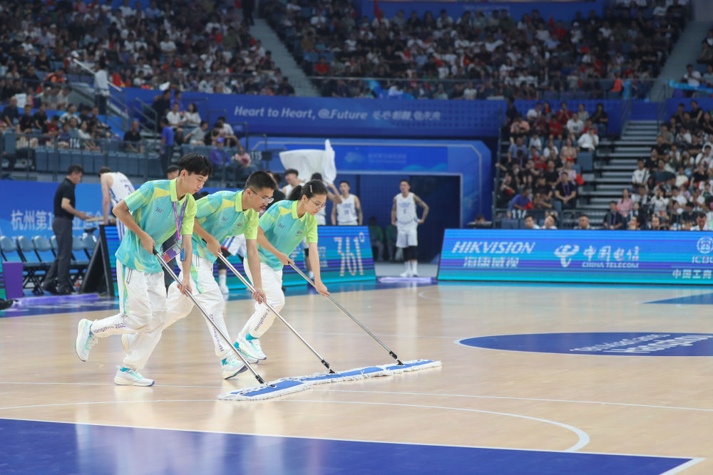 2023年9月28日,杭州亞運會志愿者“小青荷”在杭州亞運會籃球男子預賽B組比賽前清潔場地。從2016年二十國集團領(lǐng)導人杭州峰會以來,“小青荷”這一志愿服務工作品牌已成為杭州大型賽會服務的一張金名片。