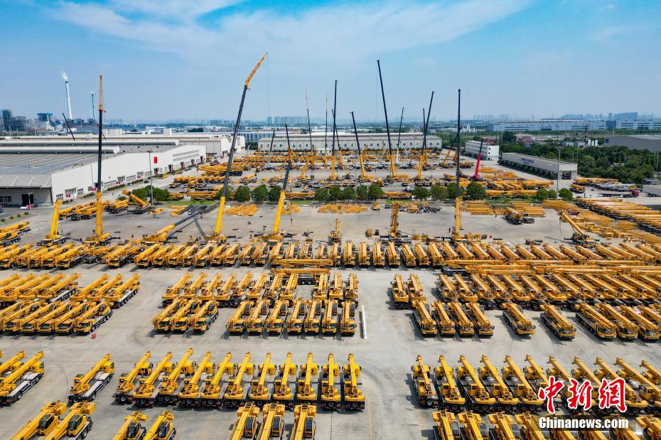 資料圖:徐工集團生產(chǎn)車間外停放的起重機。(無人機照片)泱波 攝