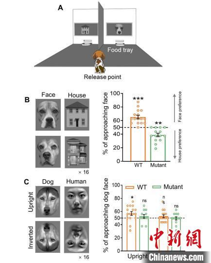 本次研究成果相關(guān)示意圖:Shank3突變?nèi)梅孔?,而野生型犬偏好面孔;野生型犬偏好同類面孔,而突變?nèi)疀]有這種偏好。中國科學(xué)院遺傳發(fā)育所 供圖