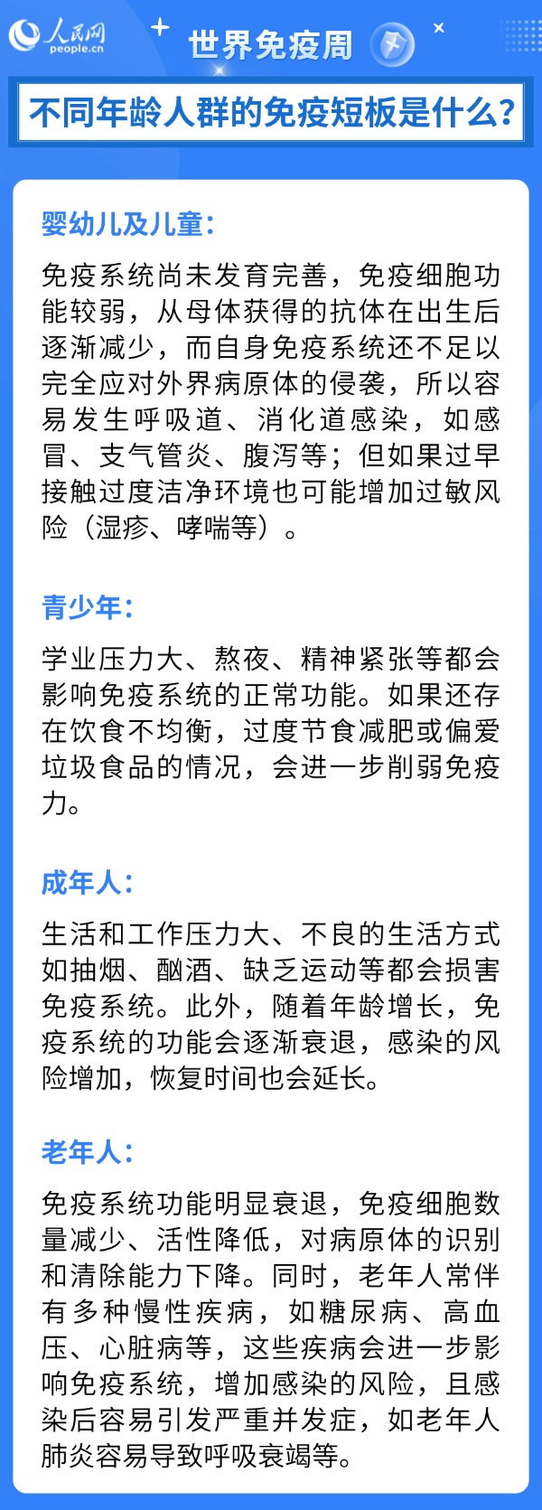 4月最后一周是世界免疫周。據(jù)說(shuō),免疫力提高了,身體好,不容易生病,即使生病也比較容易恢復(fù)……那么免疫力到底是什么?不同年齡人群的免疫短板是什么?為此,人民網(wǎng)采訪了清華大學(xué)第一附屬醫(yī)院預(yù)防保健科副主任醫(yī)師鄭東旖。
