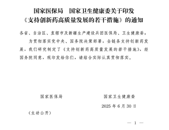 據(jù)國家醫(yī)保局網(wǎng)站消息,國家醫(yī)保局、國家衛(wèi)生健康委6月30日印發(fā)《支持創(chuàng)新藥高質(zhì)量發(fā)展的若干措施》。其中提到,加大創(chuàng)新藥研發(fā)支持力度,支持創(chuàng)新藥進(jìn)入基本醫(yī)保藥品目錄和商業(yè)健康保險(xiǎn)創(chuàng)新藥品目錄,支持創(chuàng)新藥臨床應(yīng)用,提高創(chuàng)新藥多元支付能力。