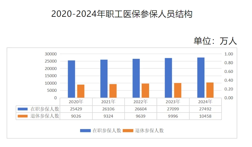 公報顯示,截至2024年底,職工醫(yī)保參保37948.34萬人,比上年增加853.70萬人,增長2.3%。其中在職職工27491.84萬人,退休職工10457.50萬人。