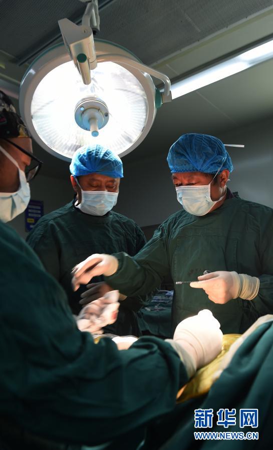 2017年5月26日,援藏醫(yī)生李家謀(右)帶領(lǐng)拉薩市人民醫(yī)院的藏族醫(yī)生進行微創(chuàng)脊柱手術(shù)。 新華社記者 覺果 攝