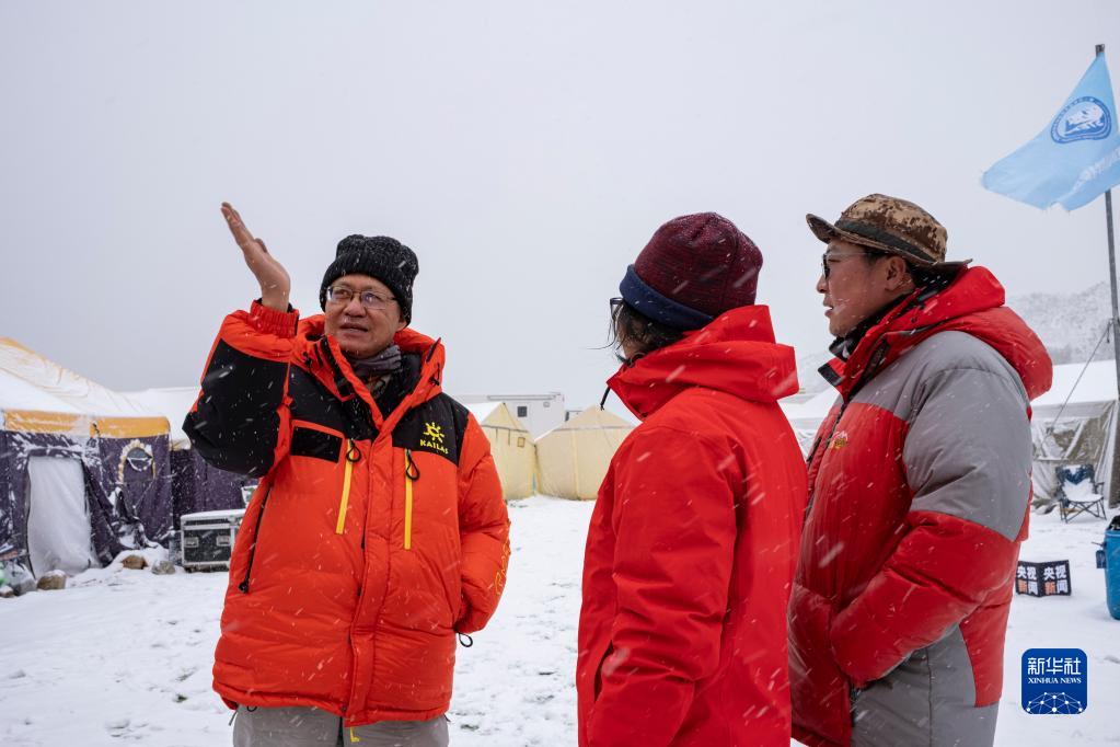 在珠峰登山大本營(yíng),朱彤(左)和科研人員交流(4月30日攝)。新華社記者 孫非 攝