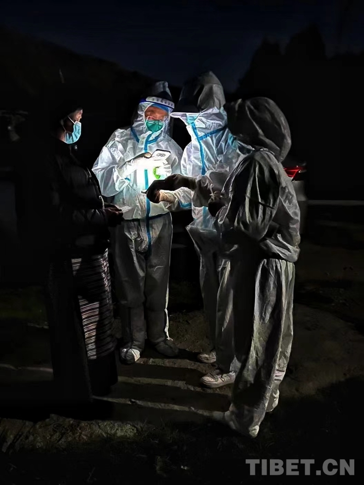 圖為8月13日凌晨,瓊結(jié)縣藏醫(yī)院醫(yī)護人員在白馬林小區(qū)進行核酸采樣工作