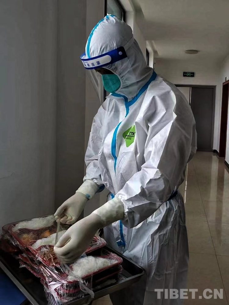圖為瓊結(jié)縣藏醫(yī)院醫(yī)護人員在瓊結(jié)縣產(chǎn)業(yè)園隔離點給隔離人員送飯