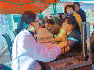 近日,由西藏林芝市人民醫(yī)院的醫(yī)護(hù)人員組成的志愿者服務(wù)隊(duì),走進(jìn)林芝市巴宜區(qū)為群眾送醫(yī)送藥送健康,把關(guān)懷送到群眾心中。圖為林芝市人民醫(yī)院醫(yī)護(hù)人員在巴宜區(qū)廈門(mén)廣場(chǎng)為群眾測(cè)量血壓。記者 張猛 史金茹 攝