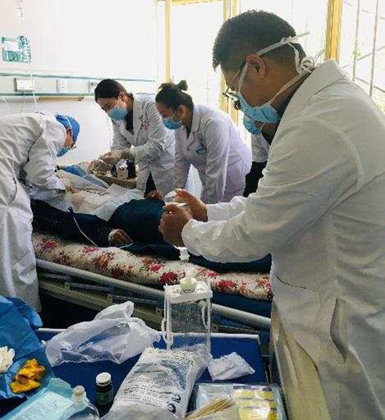 有一次,與解放軍920醫(yī)院為藏族群眾旺加聯(lián)合開展右脛骨骨折切開復(fù)位內(nèi)固定術(shù)時(shí),手術(shù)室沒(méi)有C臂透視機(jī),凳子數(shù)量不夠,只能憑借臨床經(jīng)驗(yàn)半蹲著馬步操作。高原反應(yīng)給身體帶來(lái)強(qiáng)烈的不適,隊(duì)員們?cè)?個(gè)多小時(shí)的手術(shù)時(shí)間里幾乎全程帶著氧氣,哪怕出現(xiàn)頭暈低血糖反應(yīng),仍努力堅(jiān)持到最后。手術(shù)結(jié)束后,因?yàn)獒t(yī)院電梯故障,隊(duì)員們又不顧身體的疲累,將患者旺加從2樓手術(shù)室抬到1樓病房。旺加的女兒每次見到醫(yī)療隊(duì)員查房、換藥時(shí),都會(huì)用漢語(yǔ)叫叔叔、阿姨,并拽著隊(duì)員們白大褂的衣角說(shuō)“謝謝”。
