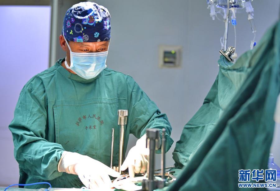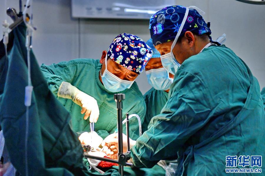 在拉薩市人民醫(yī)院第二手術(shù)室,主治醫(yī)師醫(yī)生扎西云旦為包蟲(chóng)病患者做手術(shù)(2020年12月31日攝)。新華社記者 張汝鋒 攝