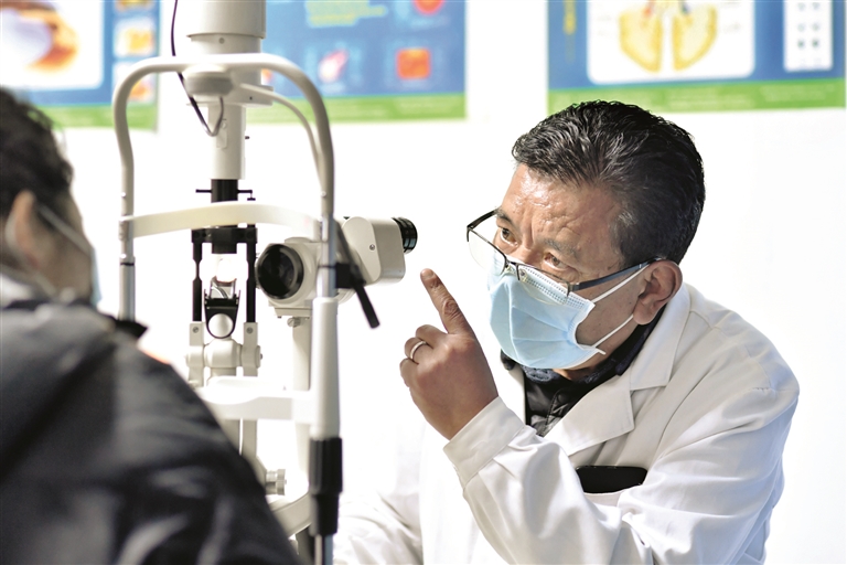 圖為3月24日,西藏拉薩光明眼科康復(fù)診療院醫(yī)生對白內(nèi)障患者進(jìn)行檢查。記者 覺果 攝