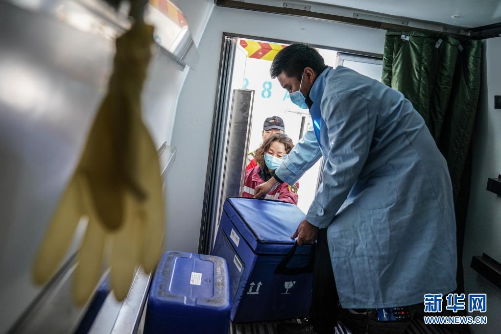 7月22日,蘆艷會(huì)在冷鏈車內(nèi)將疫苗搬出,準(zhǔn)備交付給四川甘孜州疾控中心。新華社記者 陳鐘昊 攝