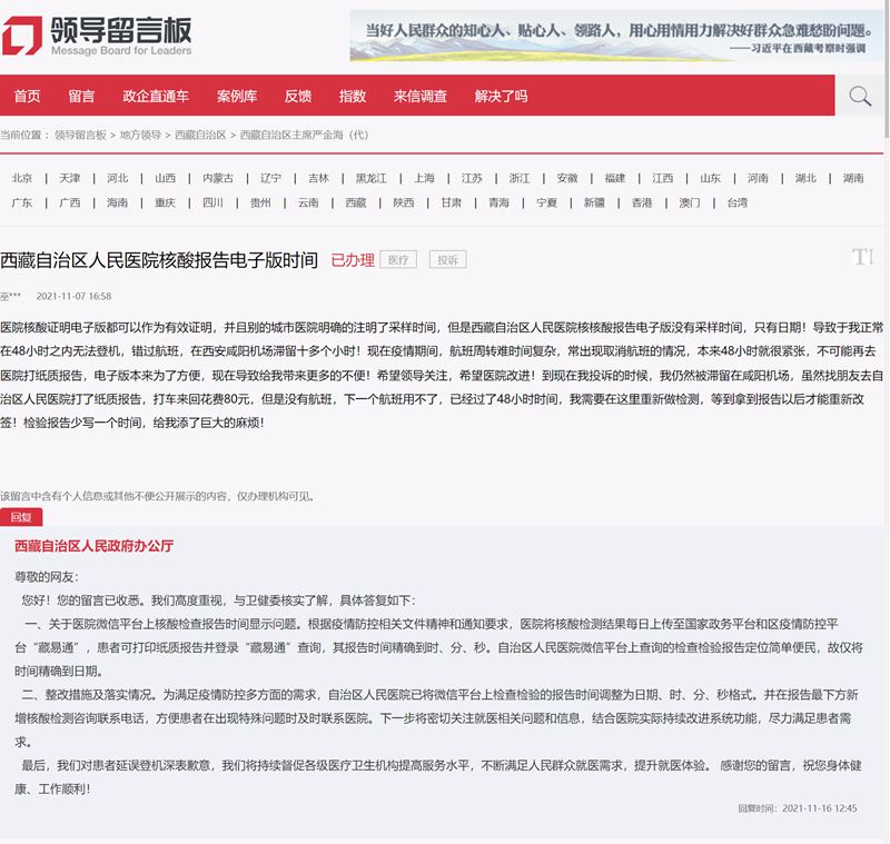 “醫(yī)院核酸證明電子版都可以作為有效證明,但是西藏自治區(qū)人民醫(yī)院的核酸檢測報告電子版沒有標注具體采樣時間,只有日期,導(dǎo)致我在48小時之內(nèi)無法登機,錯過航班……現(xiàn)在疫情期間,航班周轉(zhuǎn)難、時間復(fù)雜……電子版本來是為了方便,現(xiàn)在卻給我?guī)砀嗖槐恪边@是11月7日,西藏網(wǎng)民通過人民網(wǎng)“領(lǐng)導(dǎo)留言板”反映的問題。據(jù)悉,該網(wǎng)民因一張核酸檢測報告被滯留機場,耽誤行程,給日常出行造成了不便。