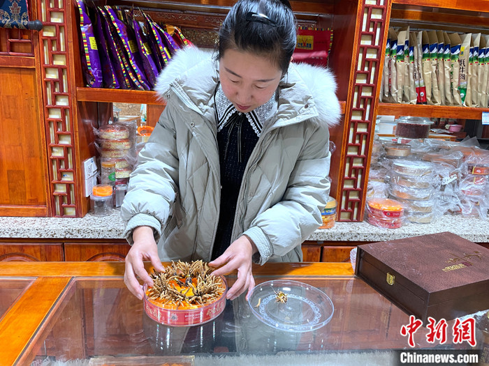 圖為商家將冬蟲夏草擺放在禮盒中。中新社記者 孫睿 攝