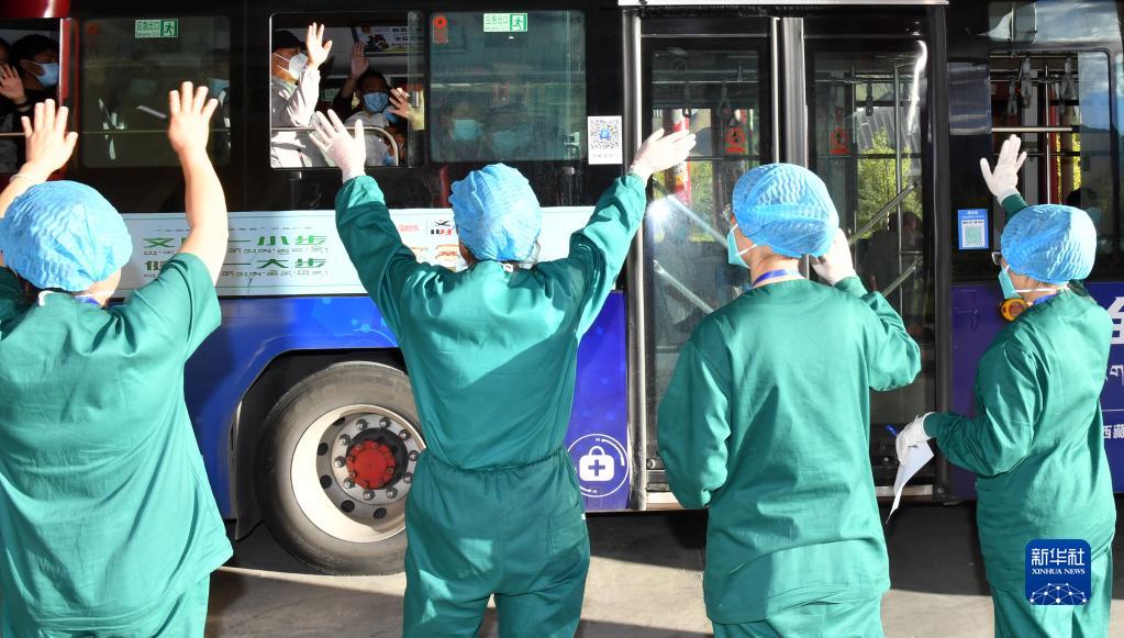 8月21日,拉薩方艙醫(yī)院的醫(yī)護(hù)人員向出艙患者揮手告別。新華社記者 覺(jué)果 攝