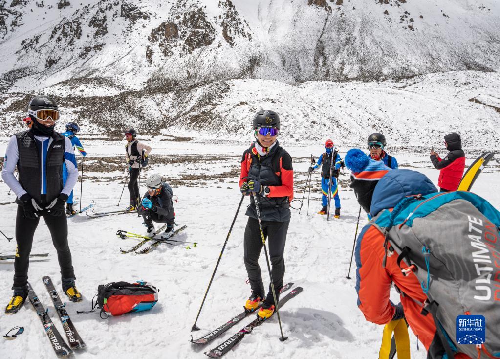 在西藏拉薩市當(dāng)雄縣羊八井鎮(zhèn),玉珍拉姆(左二)和隊(duì)友進(jìn)行滑雪登山訓(xùn)練(5月2日攝)。新華社記者 孫非 攝
