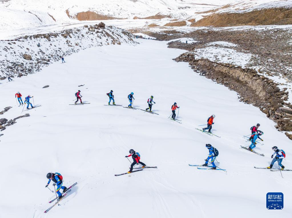 在西藏拉薩市當(dāng)雄縣羊八井鎮(zhèn),玉珍拉姆(前排左二)和隊(duì)友進(jìn)行滑雪登山訓(xùn)練(5月2日攝,無人機(jī)照片)。新華社記者 孫非 攝