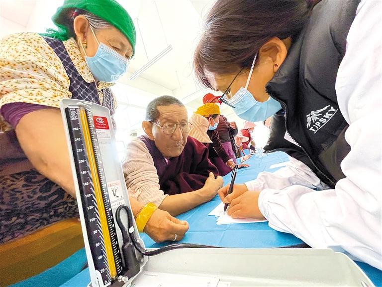 圖為義診活動中,醫(yī)護人員為群眾測量血壓。記者 次旺 攝