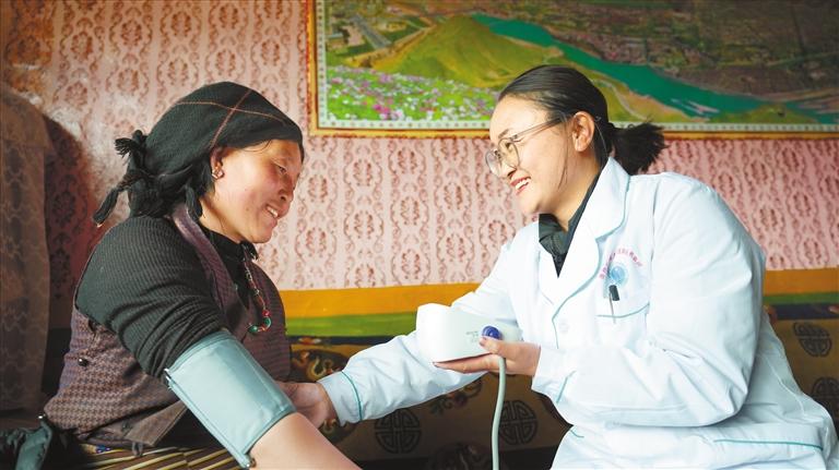 圖為墨竹工卡縣尼瑪江熱鄉(xiāng)邦達(dá)村簽約家庭醫(yī)生為村民測(cè)量血壓。記者 唐斌 通訊員 洛克 攝