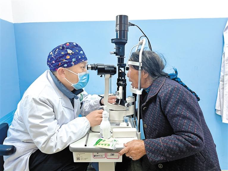 圖為醫(yī)護(hù)人員為前來問診的農(nóng)牧民群眾進(jìn)行眼部檢查。記者 丹增平措 攝