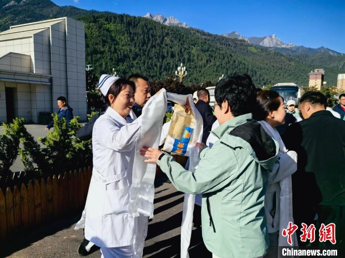 5月20日,甘南藏族自治州迭部縣人民醫(yī)院的醫(yī)護人員向“同心·共鑄中國心”志愿者敬獻哈達。劉玥晴 攝