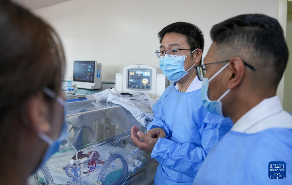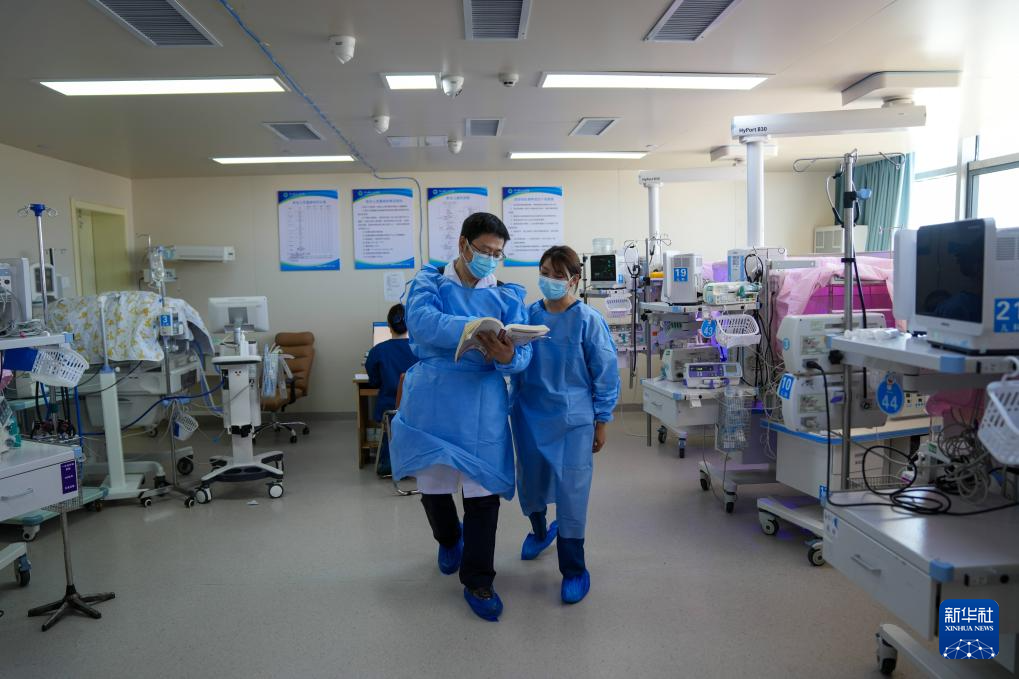 7月18日,來自大連醫(yī)科大學(xué)附屬第一醫(yī)院的援藏醫(yī)生田聰亮(前)和同事在那曲市人民醫(yī)院新生兒重癥監(jiān)護(hù)室查看及討論早產(chǎn)兒救治情況。新華社記者 晉美多吉 攝?