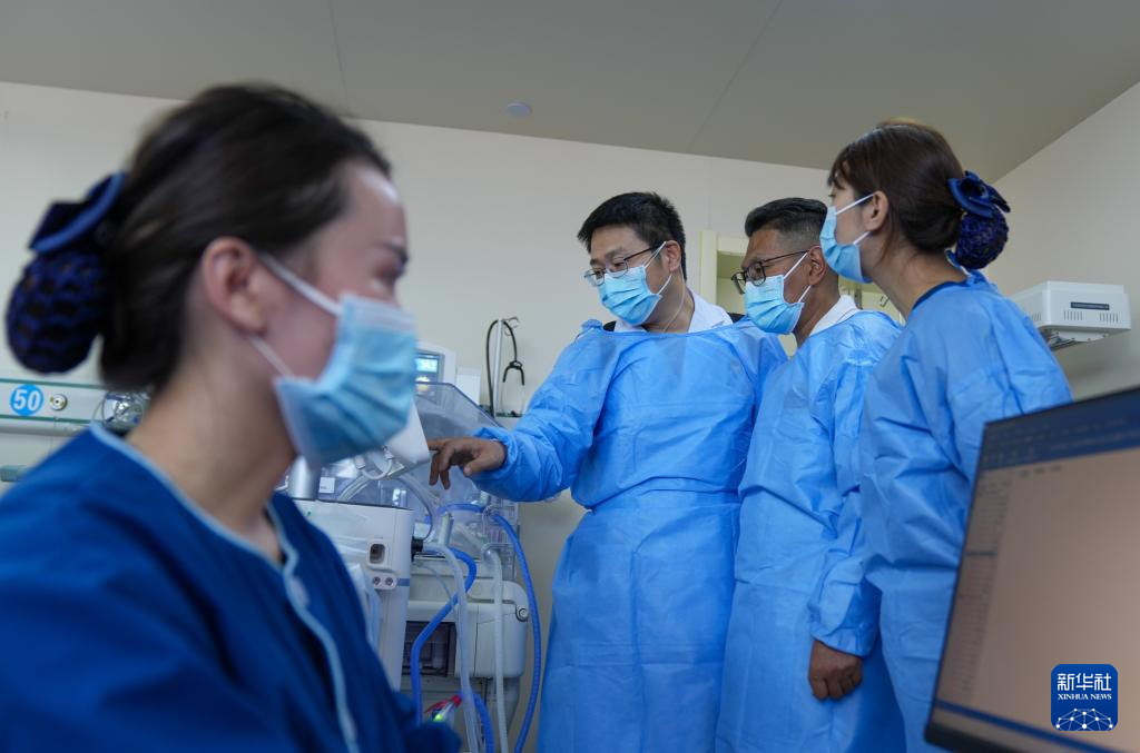 ?7月18日,來自大連醫(yī)科大學(xué)附屬第一醫(yī)院的援藏醫(yī)生田聰亮(中)和同事在那曲市人民醫(yī)院新生兒重癥監(jiān)護(hù)室討論早產(chǎn)兒救治情況。新華社記者 晉美多吉 攝?